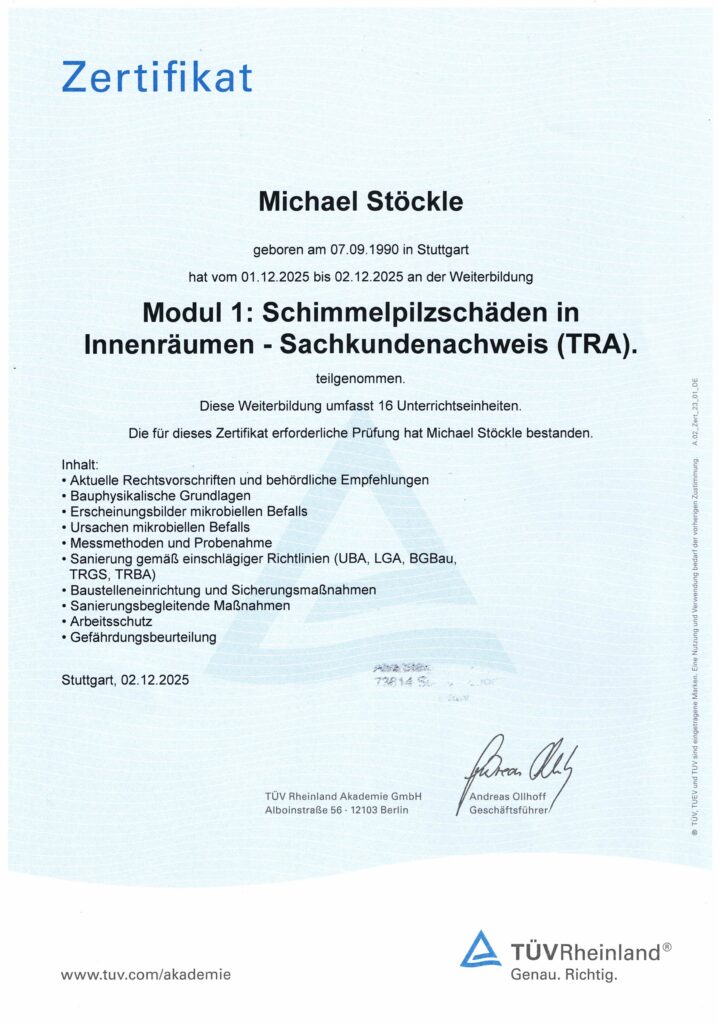 02.12.2025: Michael Stöckle hat das Sachkunden-Seminar zur Schimmelsanierung erfolgreich bestanden.