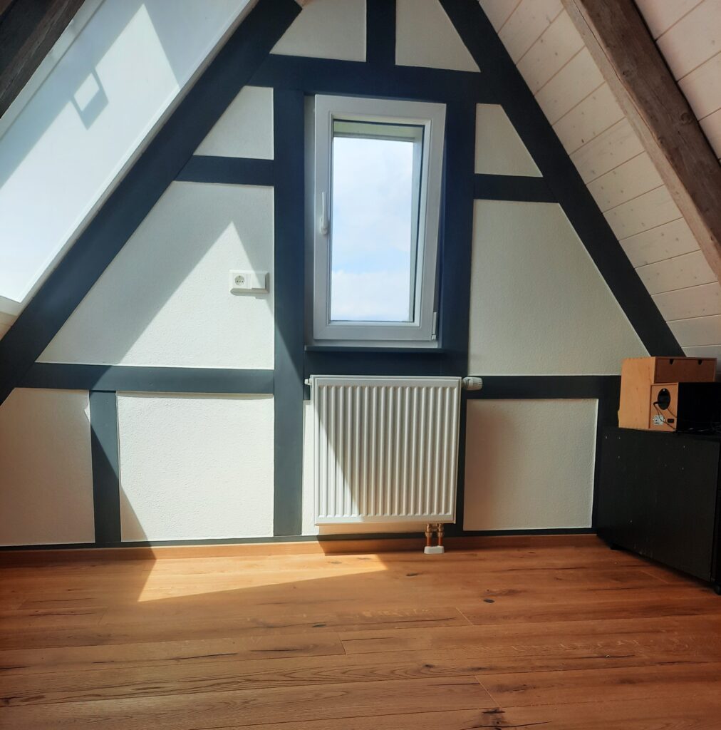 Kompletter Innenausbau eines Dachgeschosses inkl. Lackieren der Holzbalken, Verputzen und Streichen der Wandteile, Verlegen eines neuen hochwertigen Parkettbodens